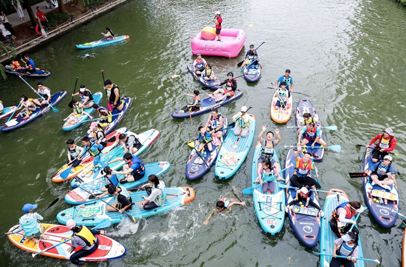 本次赛事在河岸休闲区规划“水岸灵动市集”,涵盖自行车、拳击、马术、网球等多项运动,同时设置户外运动展销区,形成集运动、亲子、消费于一体的城市水上嘉年华,促进了不同产业间的相互渗透和协同发展,彰显园区文体旅商融合发展的蓬勃生机。