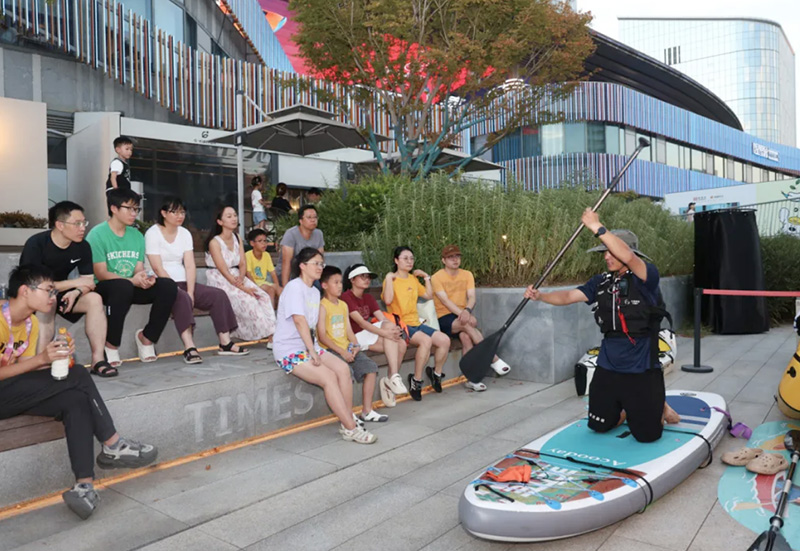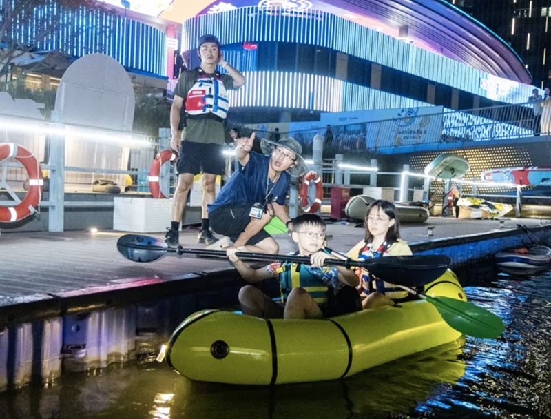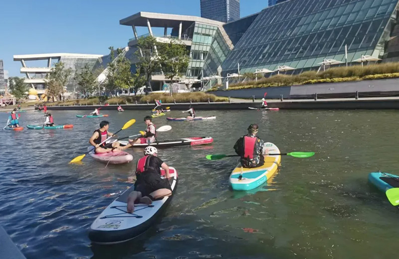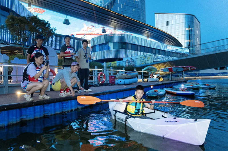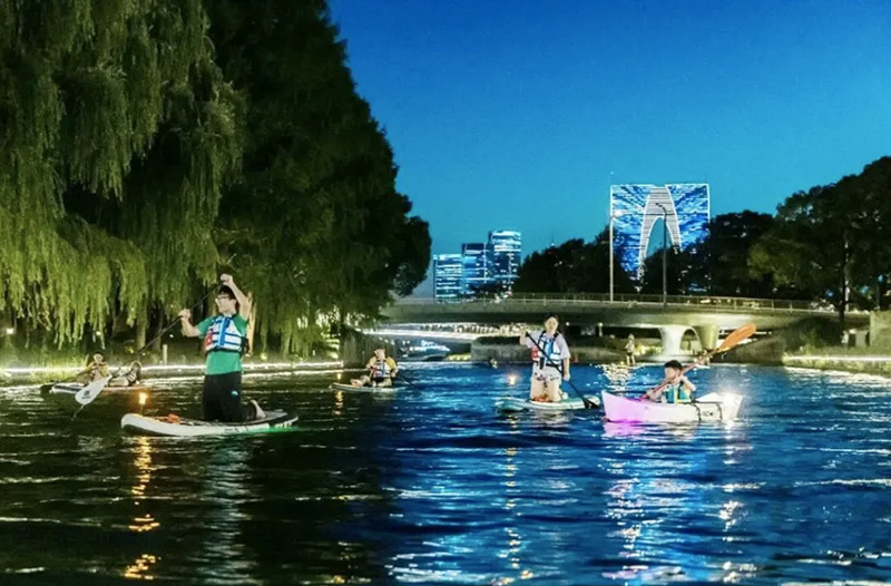 日间时段的桨板体验由专业教练现场指导,让市民能快速掌握平衡与划行技巧,体验在水面自由划行的乐趣,也有备受青睐的落日小白船,半小时的航程中,游客可沿中央河驶向金鸡湖交接处,观赏金色夕阳洒在湖面与东方之门的独特景观。