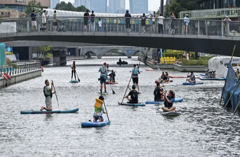 金鸡湖畔中央河码头,年轻人背着荧光色桨板走向岸边,湖面正泛着粼粼波光,远处摩天轮缓缓转动,这样的“都市水上漫游”场景,成为许多桨板爱好者选择金鸡湖作为下水点的主要原因。