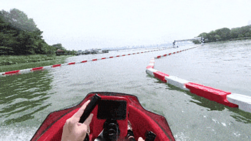 “出码头、调方向、加油门,两分钟5圈,肾上腺素直接拉满。”在桃花岛1000米赛道,记者换上救生衣体验水上卡丁船。船体采用宁德时代电芯,零排放、零噪音,智能电子围栏一出圈自动断电,最高时速锁在35km,却仍能感受“贴水漂移”。