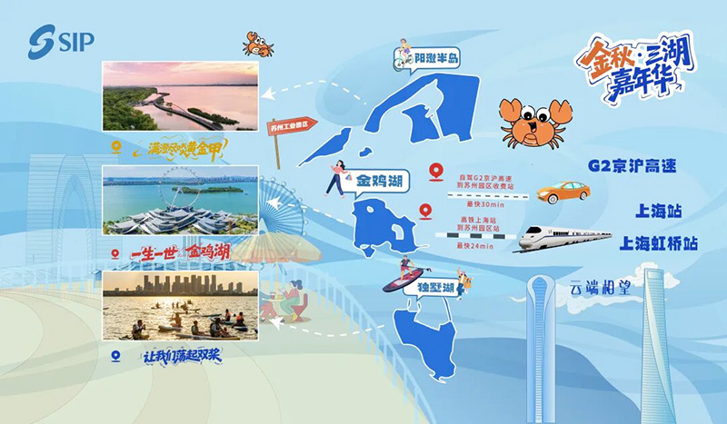 苏州与上海一衣带水、人文相融,随着长三角一体化进程加快,两地联系愈发紧密。今年秋天,园区以金鸡湖、阳澄湖、独墅湖三大湖区为核心,打造“金秋•三湖嘉年华”,推出“百项活动、千家商户、十万好礼、亿元让利”的商旅文盛会,以“商旅文体展”多元联动为特色,覆盖“吃住行游购娱”全域体验。