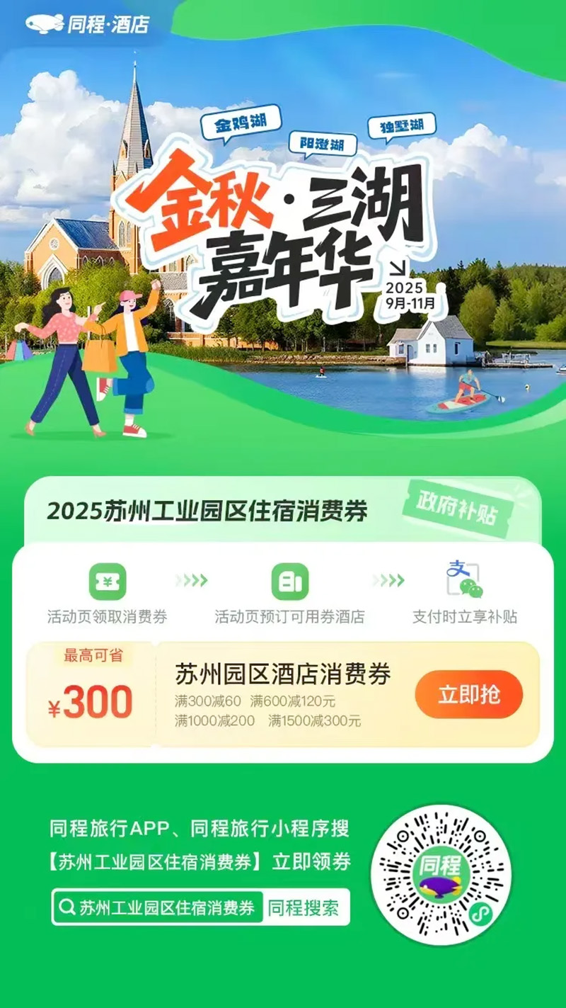 • 园区还联合同程平台发放超百万住宿消费红包,预订酒店最高立减300元。