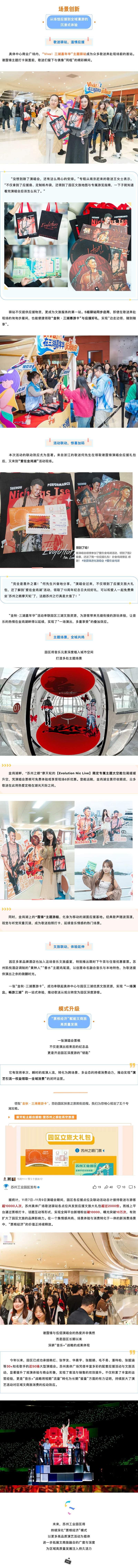 以演唱会票根为“钥匙”,园区为意犹未尽的歌迷精心打造了一场从苏州奥体中心延伸至金鸡湖、阳澄湖、独墅湖的深度漫游之旅,成功将音乐热度转化为“音乐+文旅”的创新实践,为园区文商旅融合注入全新活力。