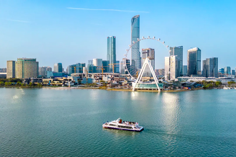 在金鸡湖,你可以体验苏州中心的潮流购物,左岸158的美食潮玩打卡;也可以乘金鸡湖游船一览湖光,登桃花岛体验水上潮玩,到688艺术潮流空间品酌微醺时光,在苏州之眼摩天轮升至浪漫顶点。金鸡湖的时尚脉搏与活力夜景,是每一位潮流漫游者的最佳选择。