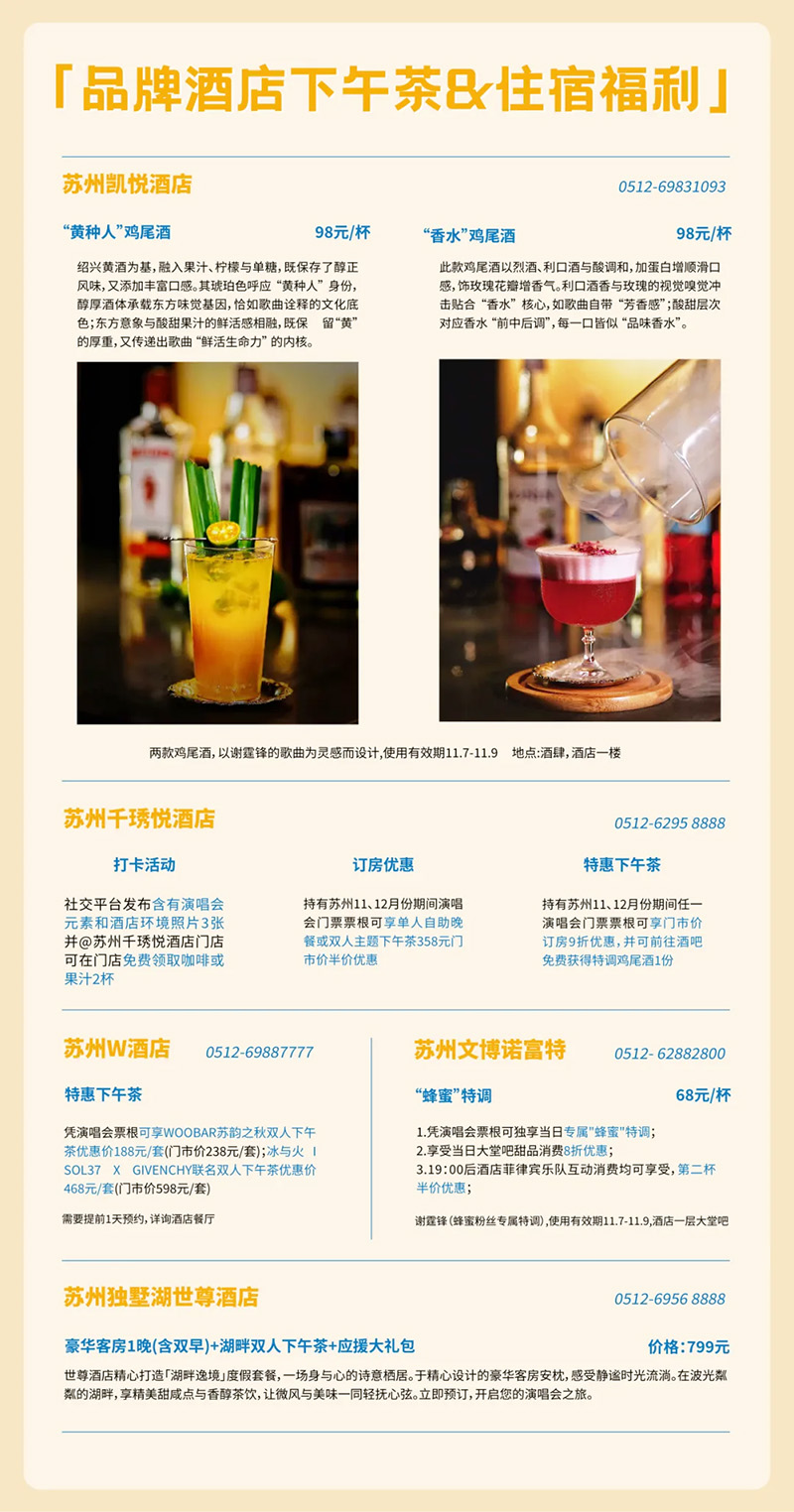 园区品牌酒店特别推出限时下午茶与住宿优惠套票,为您提供一个舒适惬意的美好时光。更有苏州凯悦酒店推出“黄种人”鸡尾酒、“香水”鸡尾酒特调,在微醺中享受园区美景。