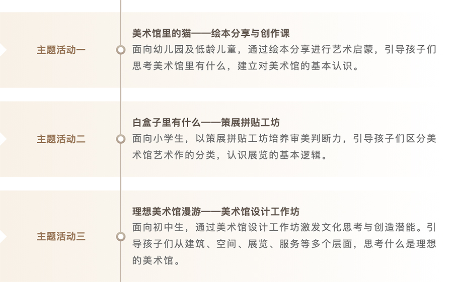“美育先锋”右岸美育计划聚焦2个社区与3所学校,围绕“认识美术馆”“理解展览逻辑”“设计理想美术馆”三大主题,全年将开展8场美育活动,将党建引领转化为具体美育行动的实践桥梁。