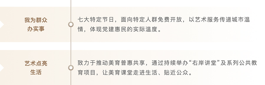 “美育先锋”惠民清单将聚焦“我为群众办实事”与“艺术点亮生活”两大板块,通过七大特定节日面向相应人群提供免费开放服务,并通过“右岸讲堂”及系列公共教育项目,全年计划举办68场公益艺术体验活动及200场公益导览,覆盖超过3000人次,真正让美育走进生活、贴近公众,使艺术资源广泛惠及于民。