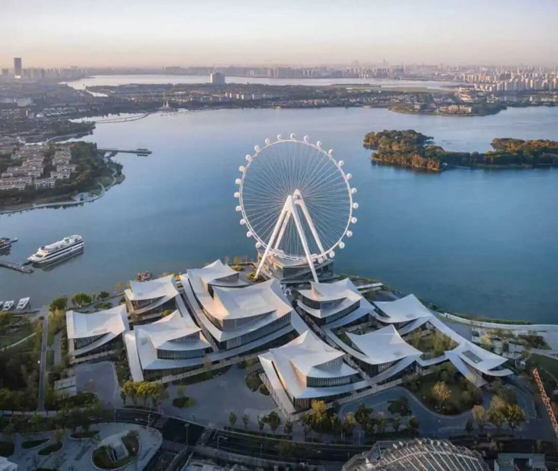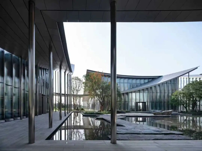 俯瞰整座美术馆,丝带状屋顶蜿蜒连绵,既是对苏州园林中“廊”的概念的全新演绎,又巧妙连接起9幢独栋单体。屋顶的不锈钢表面和立面的弧形竖向玻璃,又似中国建筑中的琉璃瓦,在阳光下下与金鸡湖水一起泛动灵动潋滟之光。一项项匠心巧思让建筑与景观交织交融,既具功能性,又有观赏性,更延展了空间感。