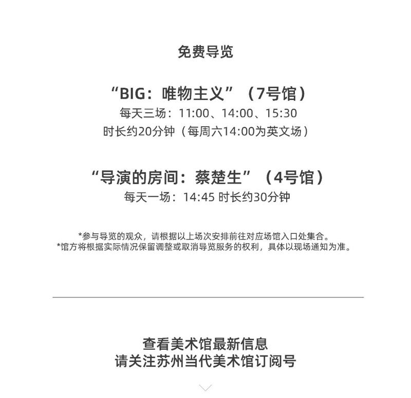 为丰富参观体验,美术馆在试运营期间提供免费定时导览服务。“苏州当代美术馆”官方网站与微信小程序已正式上线,未来将持续完善预约、会员、文创商城等功能模块。