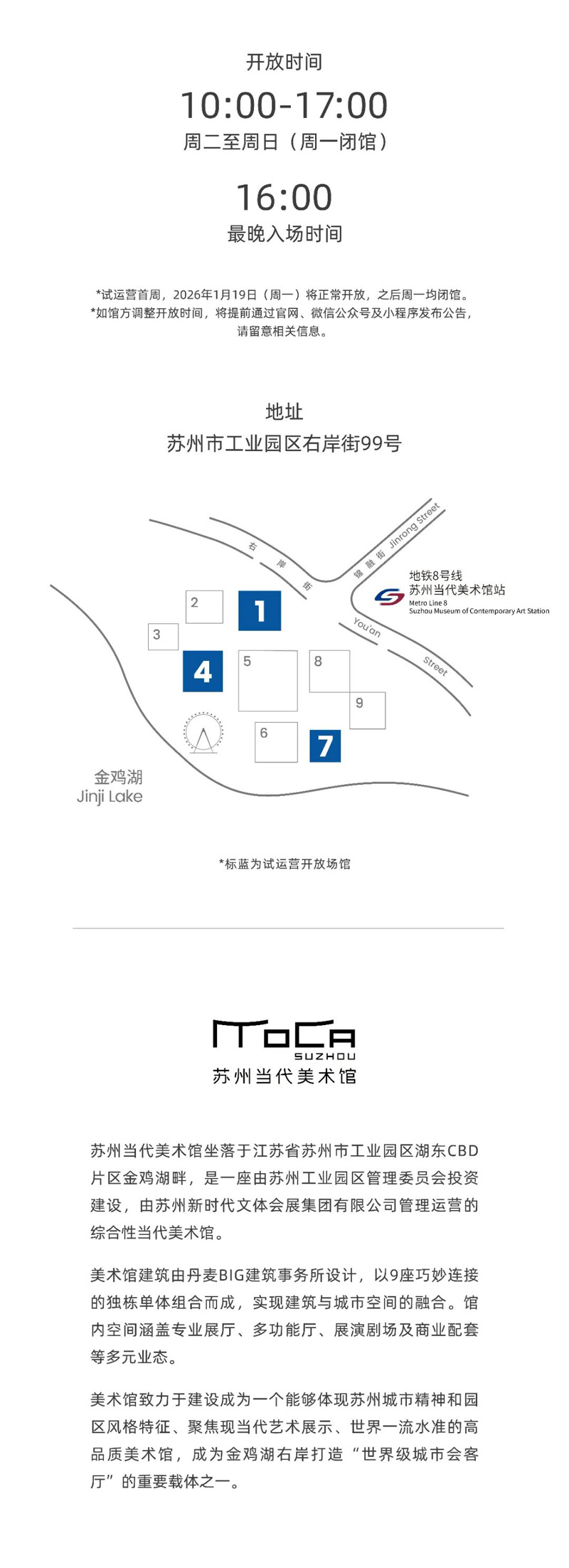 苏州当代美术馆的试运营启动,旨在对场馆设施、服务流程及观展体验进行全面测试与优化,为2026年6月的正式开馆做好准备。试运营期为2026年1月17日至3月8日,每周二至周日10:00-17:00开放(周一闭馆,最晚入场时间16:00)。