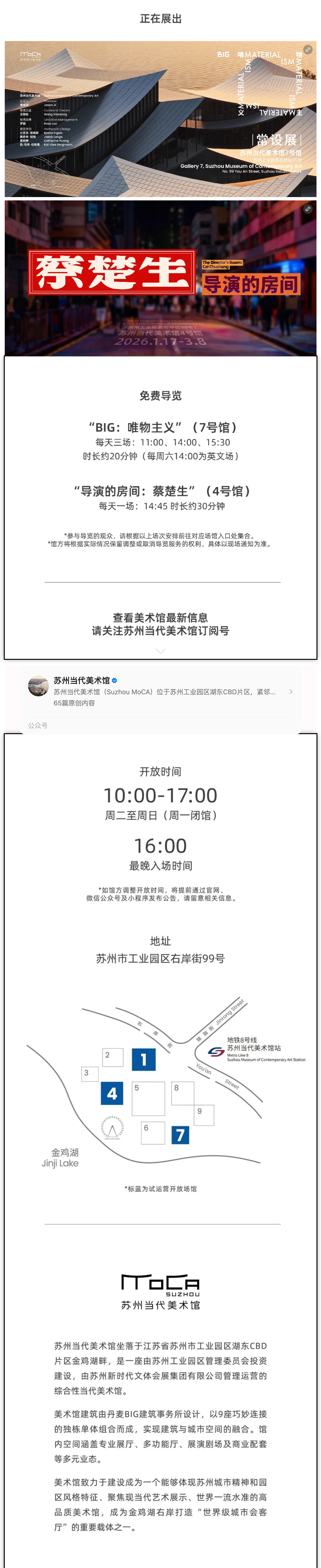 苏州当代美术馆是一座以公益、艺术、品质为核心导向的国有公共美术馆,致力于成为体现苏州城市精神和园区风格特征、聚焦现当代艺术展示、世界一流水准的高品质美术馆。美术馆于2026年1月17日至3月8日进行试运营,推出“BIG:唯物主义”与“导演的房间:蔡楚生”两个预热展览,对场馆设施、服务流程及观展体验进行系统测试,并计划于2026年6月底正式全面开馆。